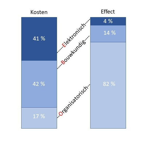 In de voorstelling hierboven wordt aangetoond dat de maatregelen die het meeste effect hebben, de minsten kosten met zich meedragen.